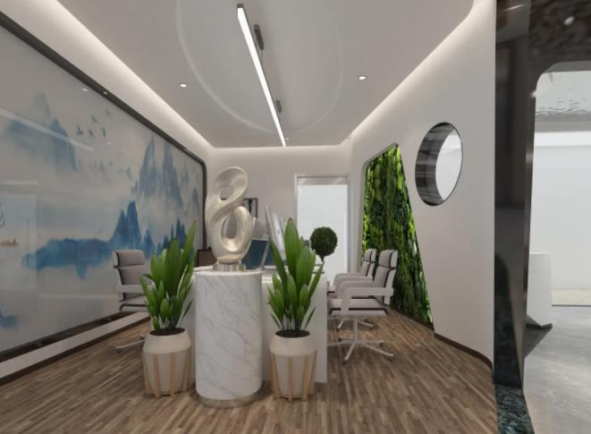 3、天花水波紋鏡面不銹鋼波光粼粼,倒影婆娑,中間點(diǎn)綴白色射燈,星光點(diǎn)點(diǎn),仿佛仰望銀河,體驗(yàn)區(qū)靠落地窗橢圓拱形網(wǎng)狀金屬鏤空材質(zhì),霧里看花,花更美,營(yíng)造朦朧隱約東方詩(shī)意之境,呼應(yīng)品茶洽談區(qū)中式嵌入式茶桌,讓顧客感受尊貴體驗(yàn)同時(shí)一覽江景,身心徹底放松達(dá)到物我兩忘之境。辦公樓產(chǎn)品展示區(qū)蜂窩背發(fā)光造型突出展品的高科技品質(zhì)感。辦公區(qū)裝飾設(shè)計(jì):山水玻璃隔斷與綠植墻共同營(yíng)造呼吸在山水綠意之間的意境,讓工作充滿詩(shī)意與生機(jī),通透圓形玻璃與前廳區(qū)連接,運(yùn)用借景設(shè)計(jì)手法,給空間帶來意趣。